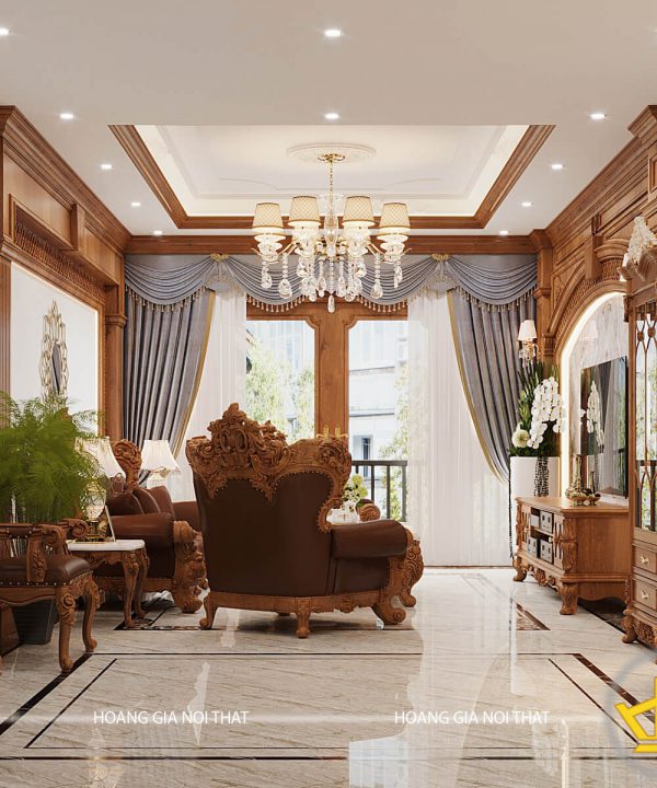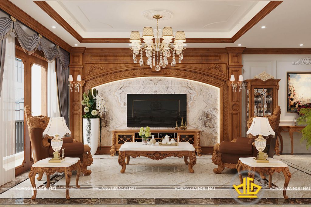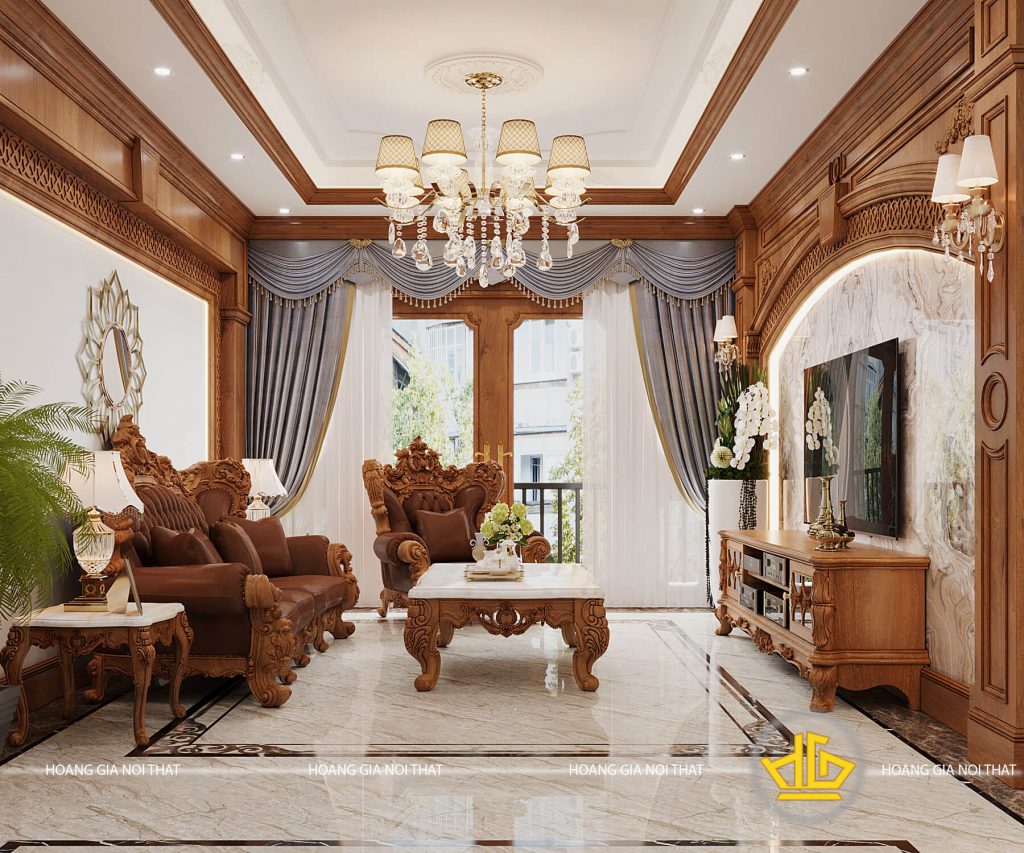 Một cửa sổ lớn được thiết kế tại phòng khách để lấy ánh sáng tự nhiên kèm một rèm được thiết kế theo kiểu hoàng gia vừa có vai trò trang trí lại giúp điều chỉnh ánh sáng. Một chiếc tivi được gắn cố định trên tường được ốp lớp đá hoa cương sáng bóng kèm một tủ nhỏ bên dưới được thiết kế hoa văn giống với bộ sofa tạo sự hài hoà cho không gian.
