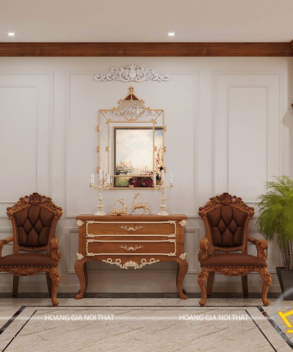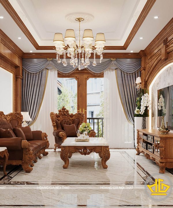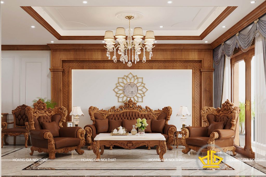 Vừa bước chân nhà Anh Minh, chắc chắn bạn sẽ cảm thấy choáng ngợp bởi sự lộng lẫy và xa hoa trước không gian được bố trí toàn đồ nội thất bằng gỗ đầy sang trọng. Và món nội thất phòng khách tân cổ điển không thể thiếu đó là bộ sofa tiếp khách luôn nằm ở vị trí trung tâm và cũng là món đồ nội thất nổi bật nhất trong không gian phòng khách nhà Anh Minh. Những đường cong tinh tế, hoa văn uốn lượn được chạm khắc tỉ mỉ trên thành ghế, chân ghế và trên bàn trà thể hiện rõ nét tân cổ điển thu hút bất cứ vị khách nào tới đây chơi.