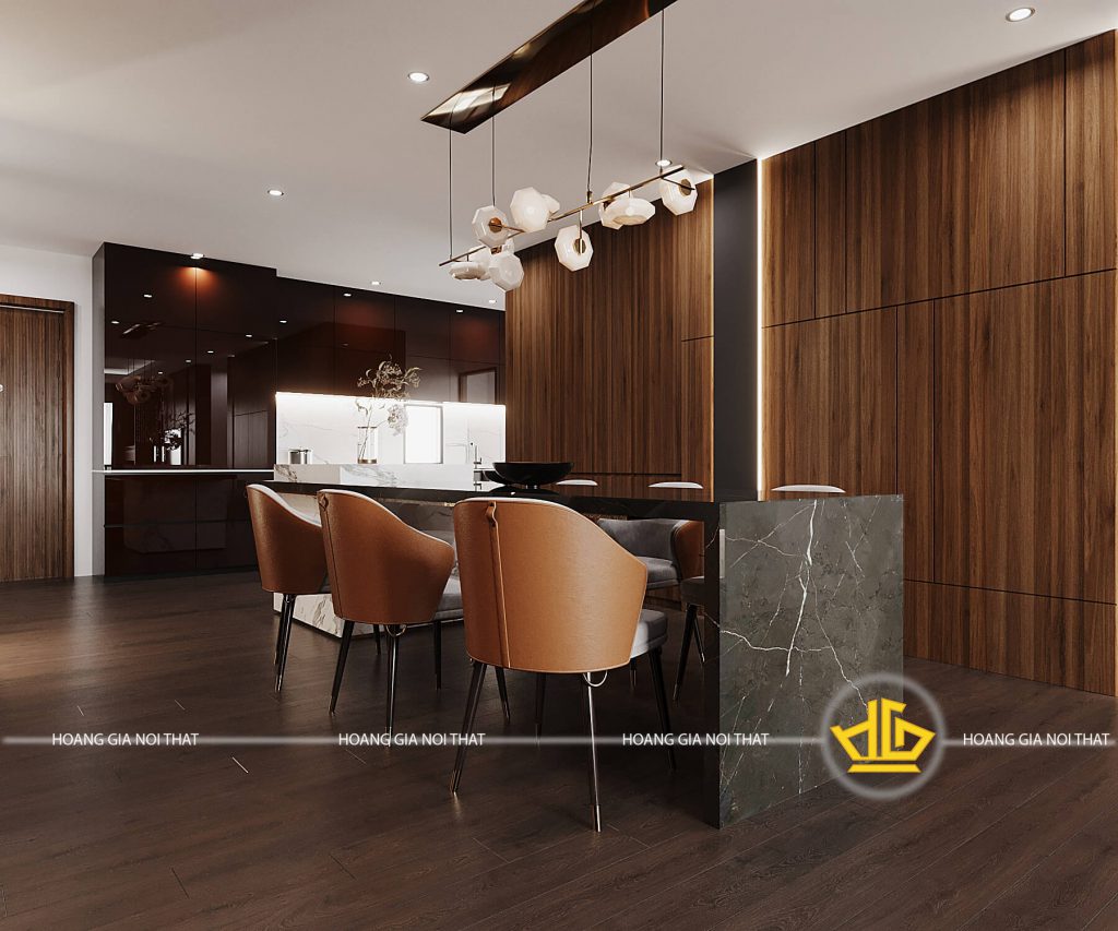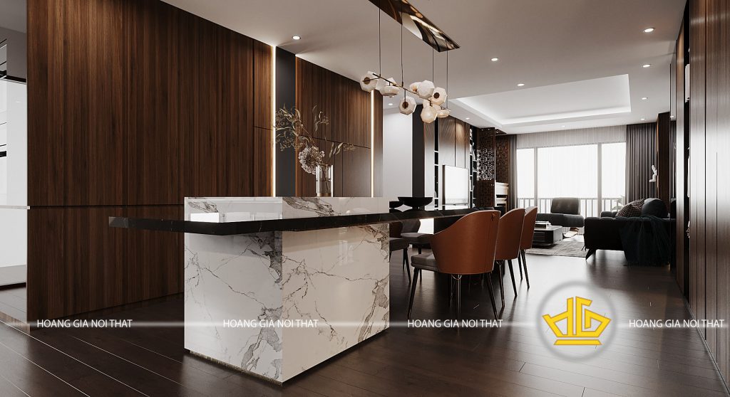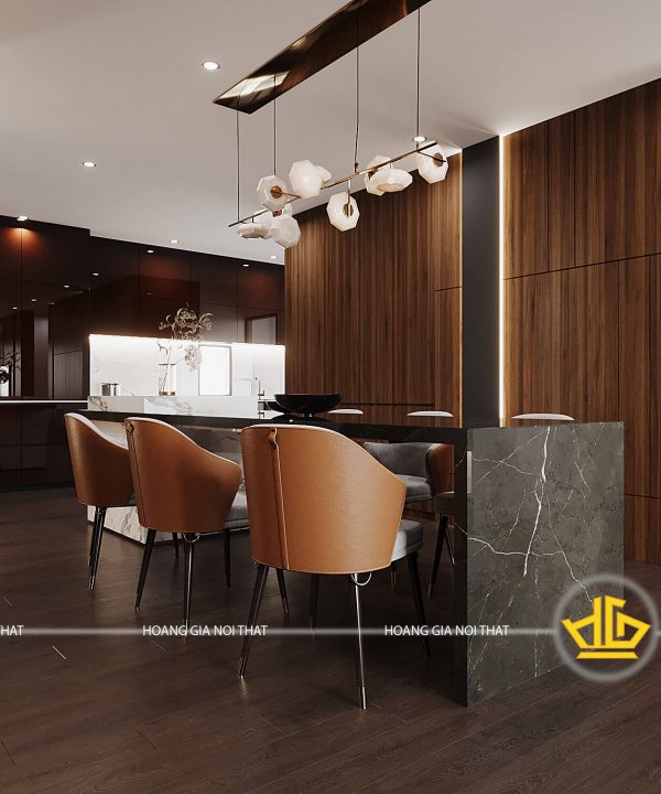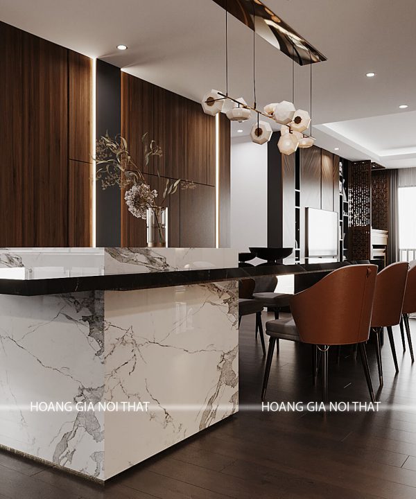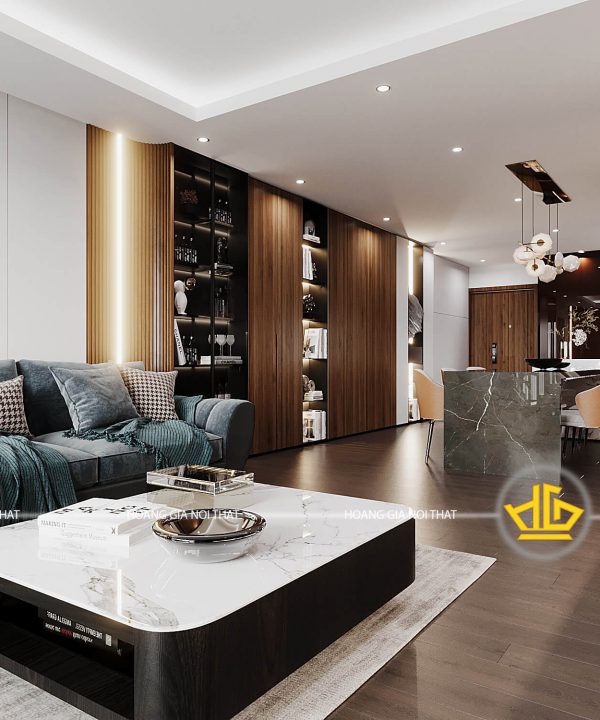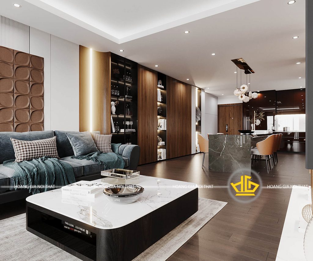 Màu gỗ chủ đạo kết hợp với màu xám lạnh của bộ sofa tạo nên sự cân bằng cho không gian. Ngoài ra, các chi tiết đèn chùm tinh tế, bàn đá đơn giản cũng góp phần mang lại một cảm giác thư giãn, nhẹ nhàng cho phòng khách. Bên trong phòng khách còn được Hoàng Gia đặc biệt bố trí những kệ tủ để gia chủ có thể cất giữ những chai rượu vang có giá trị, tạo nên một góc ấn tượng thu hút người nhìn.