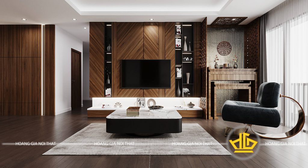 Mẫu phòng khách này dành riêng cho những ai thích không gian sang trọng nhưng lại có diện tích phòng khách không quá lớn. Những mảng phối được Hoàng Gia trang trí bằng những nội thất làm từ vật liệu hiện có màu trung tính, giúp phòng khách của bạn đẳng cấp, tinh tế đến từng milimet.