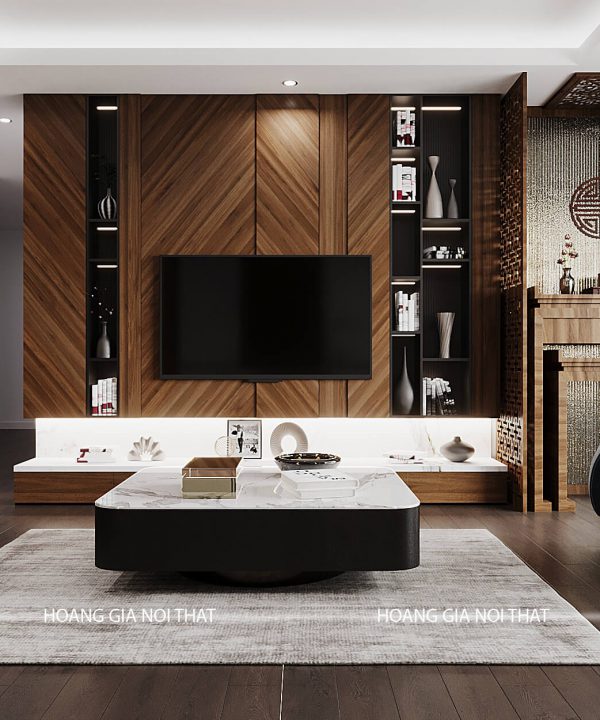 Tông màu trầm ấm thể hiện sự đẳng cấp, sang trọng từ các bộ tủ, kệ được làm từ chất liệu gỗ ẩn chứa bên trong sự thân quen, mộc mạc và ấm áp mà gia chủ mong muốn. Có lẽ đây cũng là lý do mà rất nhiều người luôn chọn nội thất bằng gỗ để trang trí cho phòng khách của mình, dù không gian trang trí được thiết kế theo phong cách cổ điển hay hiện đại thì nội thất bằng gỗ vẫn đáp ứng được tính thẩm mỹ cao.