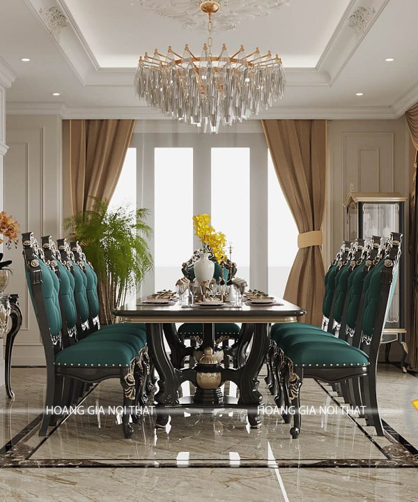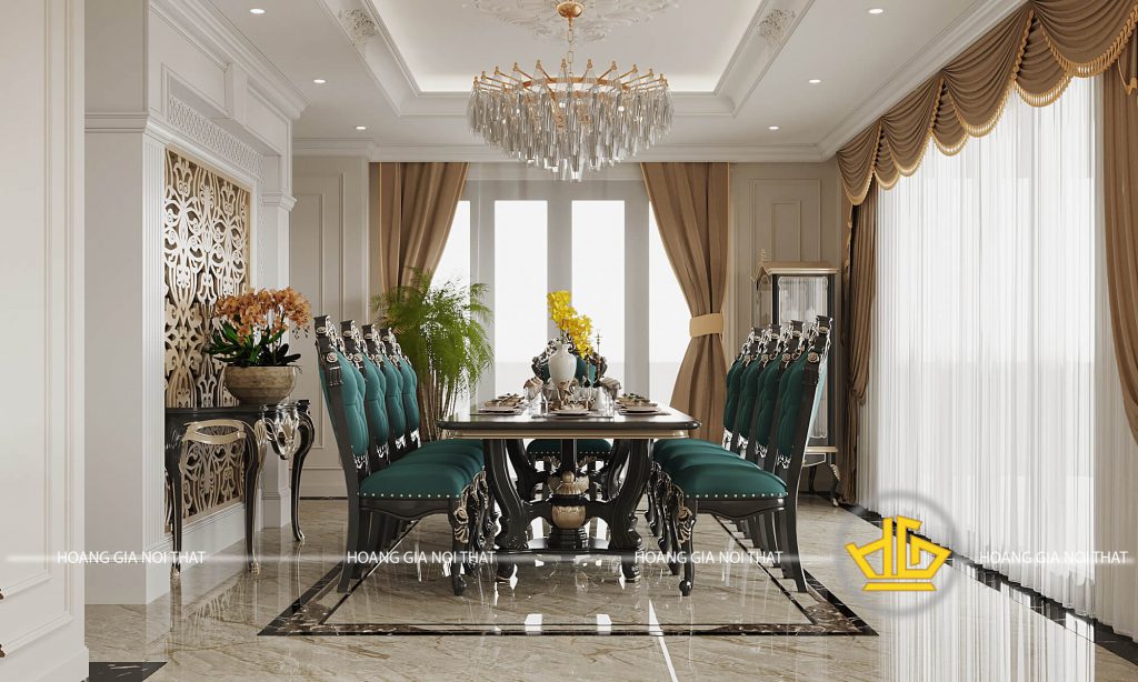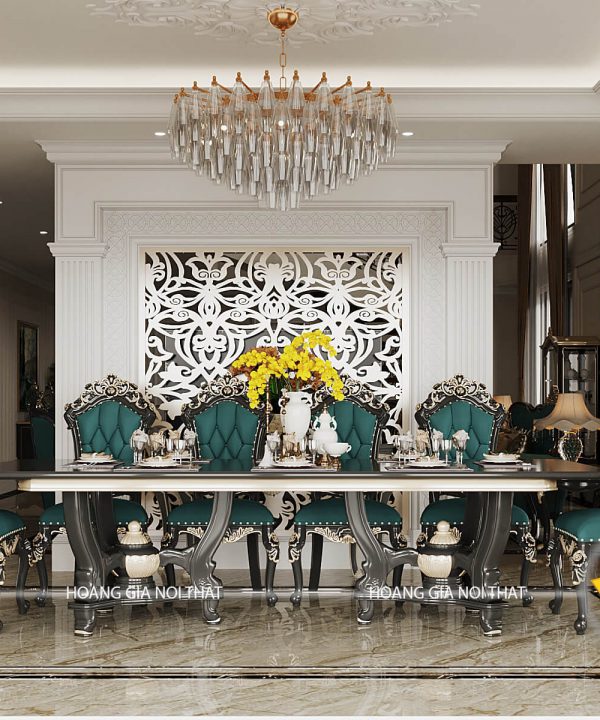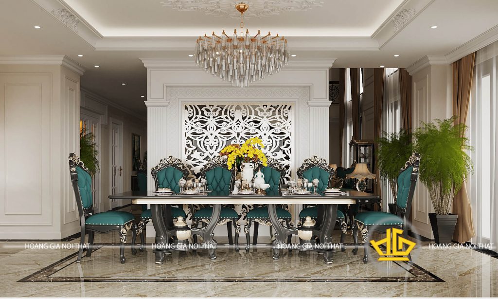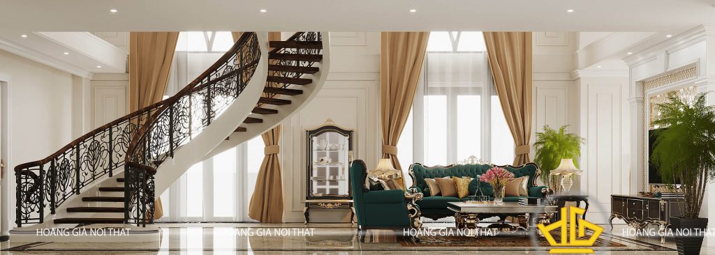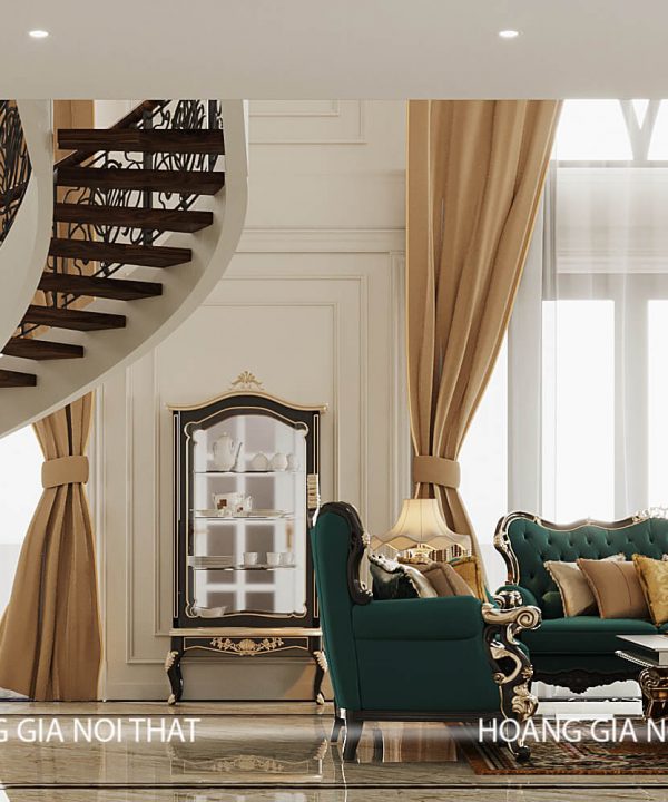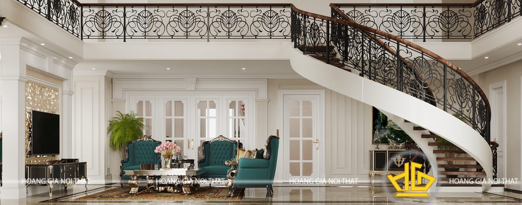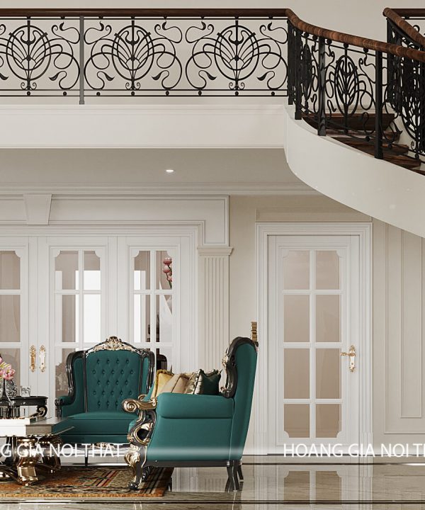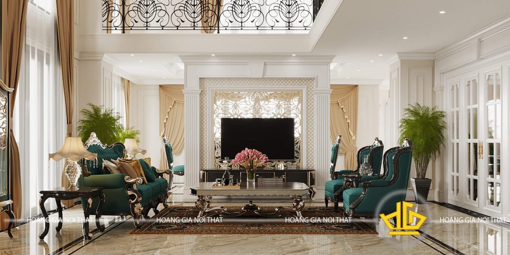 Với phòng khách này được thiết kế không quá cầu kỳ, rườm rà và xa hoa như phong cách cổ điển, nội thất tân cổ điển tại phòng khách này được các kiến trúc sư Hoàng Gia thiết kế nhẹ nhàng ghi dấu ấn bằng bộ bàn ghế màu xanh ngọc và những đường cong tinh tế trên các món đồ nội thất, hơn nữa khi đặt trong một không gian có tone màu trắng sẽ làm nổi bật cả phòng khách. Thể hiện những giá trị cao về nghệ thuật trong kiến trúc và thỏa mãn nhu cầu thẩm mỹ của gia chủ