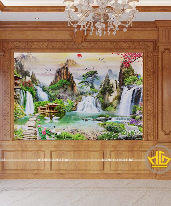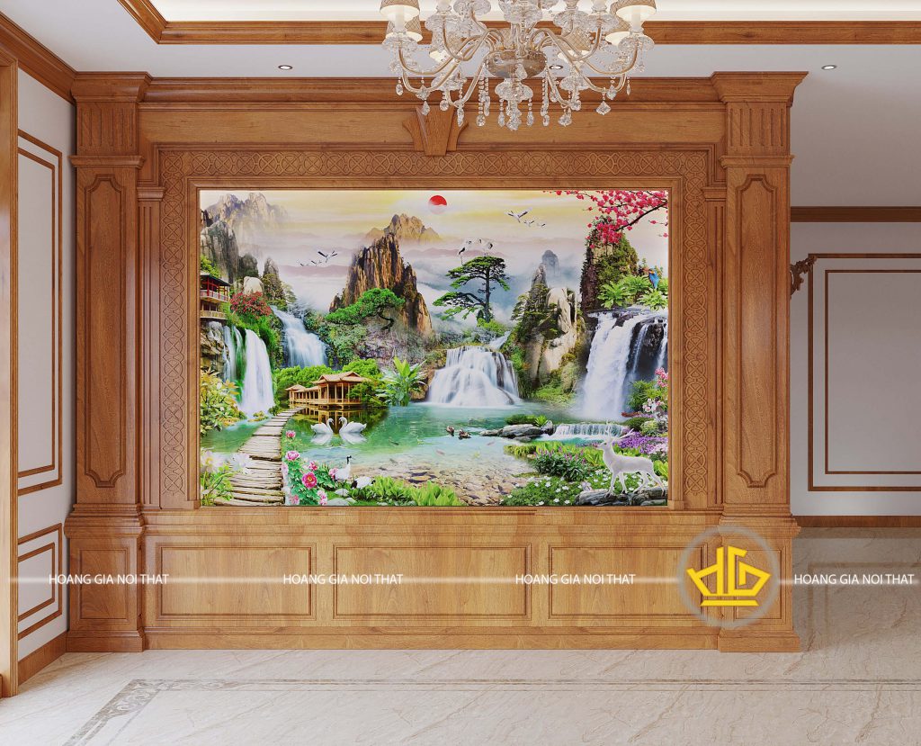 Trang trí thêm cho phòng khách tân cổ điển một vài bức tranh vào các bức tường để tạo điểm nhấn hoàn hảo cho toàn bộ không gian. Ở đây với đồ nội thất bằng gỗ tự nhiên thì Hoàng Gia lựa chọn cho phòng khách nhà Chú Tình một bức tranh thiên nhiên cỡ lớn. Họa tiết trên bức tranh được thiết kế tinh xảo, mềm mại và uyển chuyển kết hợp với màu gỗ tạo nên tính thẩm mỹ cao cho không gian.