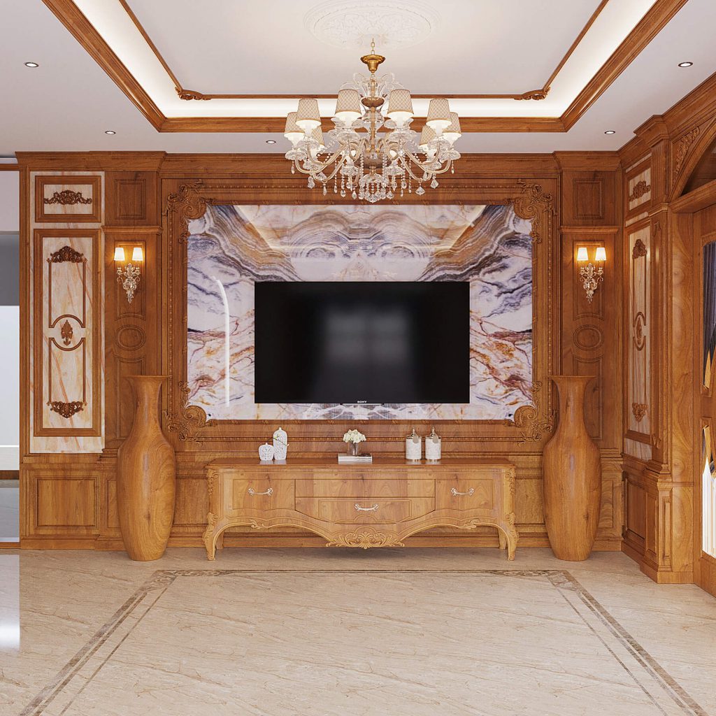 Như trong mẫu thiết kế trên, Hoàng Gia và Chú Tình đã thống nhất chọn lựa chất liệu gỗ cho tất cả các đồ nội thất bên trong phòng khách. Với không gian rộng rãi của nhà Chú Tình thì sử dụng nội thất phòng khách tân cổ điển bằng gỗ tự nhiên sẽ thể hiện được đẳng cấp của gia chủ, sự xa hoa và đem đến tính thẩm mỹ cao cho không gian phòng khách tân cổ điển bền đẹp theo thời gian.