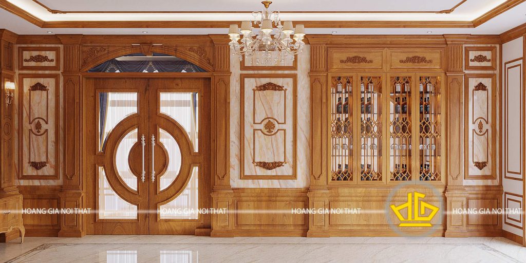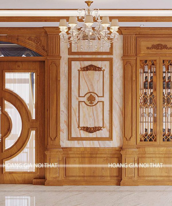 Với không gian phòng khách tân cổ điển, bạn có thể lựa chọn hai loại tủ là tủ decor trang trí hoặc tủ rượu phù hợp với phong cách phòng khách. Chú Tình là người thích thưởng thức và sưu tầm những chai rượu vang ngon, nên Hoàng Gia đã thiết kế tủ rượu để chú trưng bày được những chai rượu quý cũng như bảo quản rượu một cách tốt nhất. Tủ rượu này cũng được làm bằng gỗ tự nhiên chắc chắn, giúp cho không gian, phòng khách thêm ấn tượng và nâng tầm đẳng cấp của gia chủ.