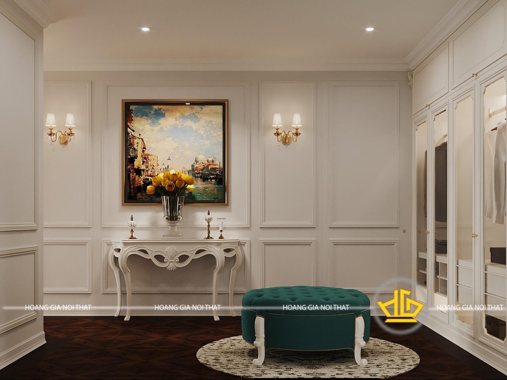 - Những đồ nội thất khác: Điểm đặc trưng thứ hai cho phòng ngủ tân cổ điển là sự cầu kỳ trong trang trí, tuy nhiên cũng không nên bày trí quá nhiều đồ nội thất cho không gian. Ngoài giường ngủ chỉ cần thêm tủ áo quần, đèn ngủ, rèm cửa, một chiếc bàn nhỏ…. Và những đồ nội thất này luôn được Hoàng Gia ưu tiên lựa chọn những nội thất cao cấp và cùng tone màu tường và chiếc giường để tạo nên nét âm hưởng và sự quyền quý của gia chủ.