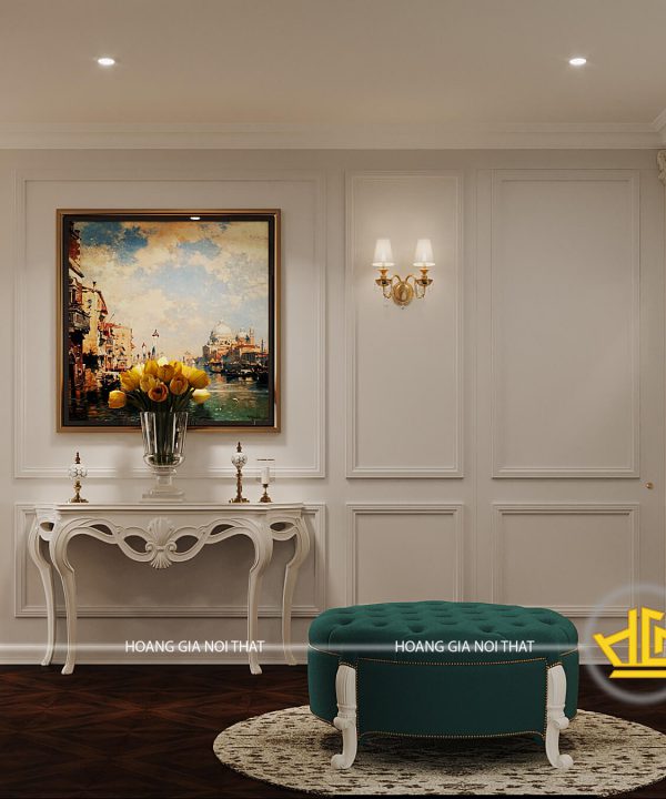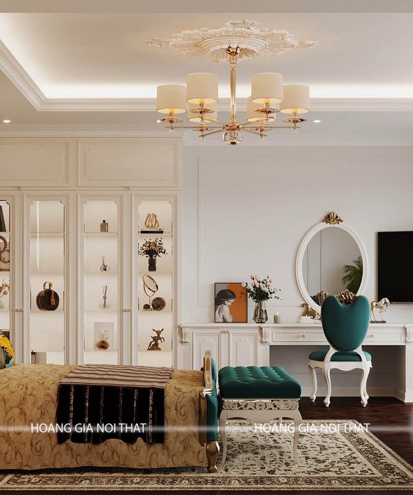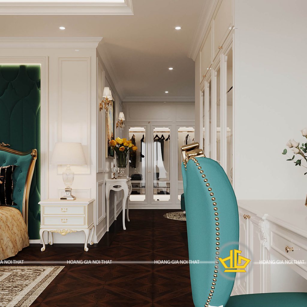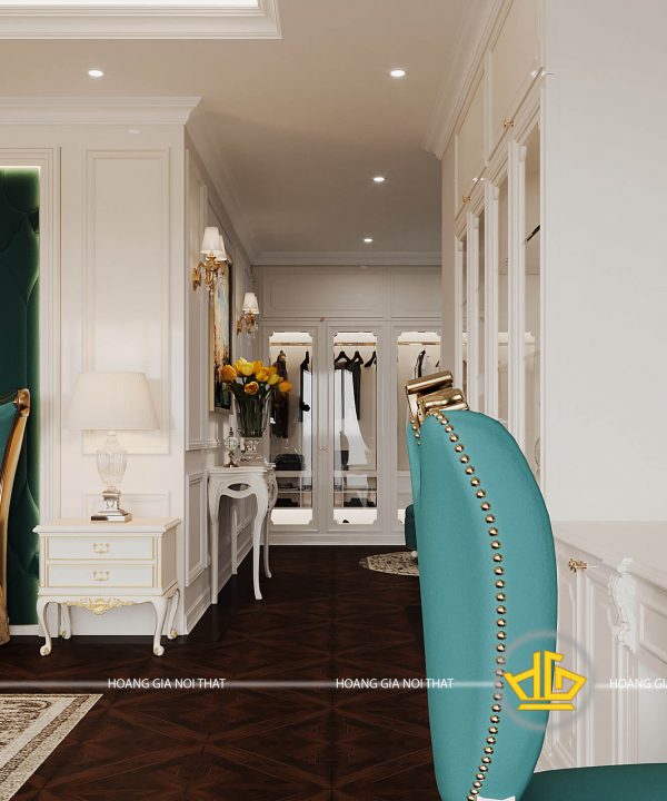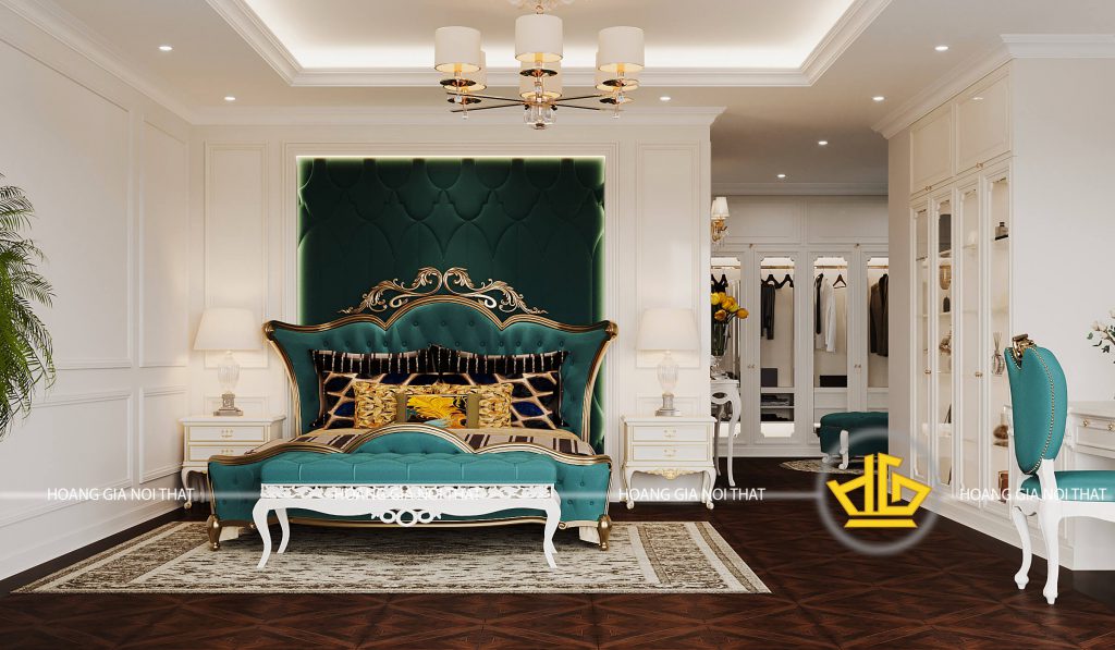 - Chiếc giường ngủ cho phong cách tân cổ điển được chạm khắc những hoa văn tỉ mỉ trong từng chi tiết. Và đây là một khách hàng nam nên Hoàng Gia đã chọn một chiếc giường có màu xanh nam tính kết hợp một chiếc ghế được bọc nệm màu xanh cùng màu đặt ngay dưới chân giường… Đây chính là điểm nhấn để phòng ngủ tân cổ điển tone nền màu trắng trở nên nổi bật, ấn tượng và thu hút hơn. Ngoài ra, chúng tôi thiết kế ở phần đầu của chiếc giường ngủ có điểm nhấn đặc biệt, điều này sẽ thu hút ánh nhìn của mọi người khi bước vào phòng ngủ cảm thấy ấm cúng và tinh tế, đồng thời những con mắt ngưỡng mộ về tính thẩm mỹ dành cho gia chủ.