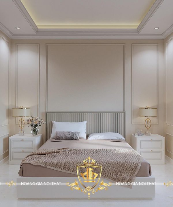 Giường ngủ được thiết kế hiện đại đặt chính giữa phòng với vị trí trung tâm, với yếu tố phong thuỷ đã được cân nhắc cẩn thận, chất liệu đảm bảo tuyệt đối sẽ làm cho căn phòng của bạn nổi bật hơn, cạnh giường ngủ được thiết kế thêm 2 tủ nhỏ vừa có thể để đèn ngủ và có thể để được đồ dùng cá nhân để trang trí, tạo cảm giác mới mẻ cho phòng ngủ của bạn.
