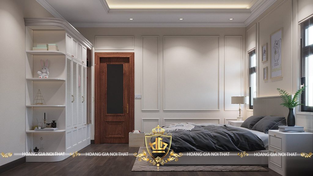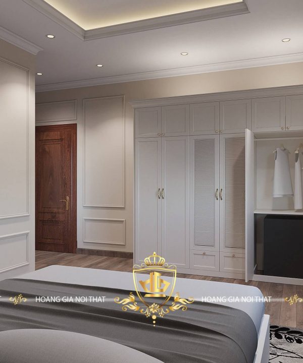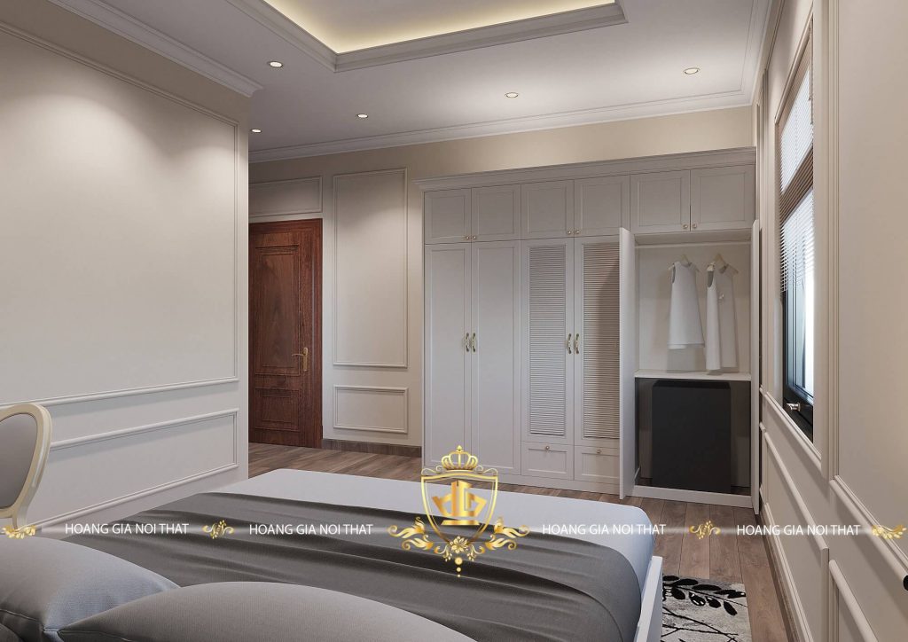 Không gian phòng ngủ được thiết kế kết hợp thêm tủ quần áo màu trắng kem và sàn gỗ hiện đại, càng tôn lên được vẻ sang trọng của tổng thể căn phòng.