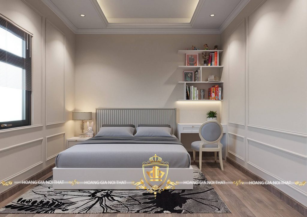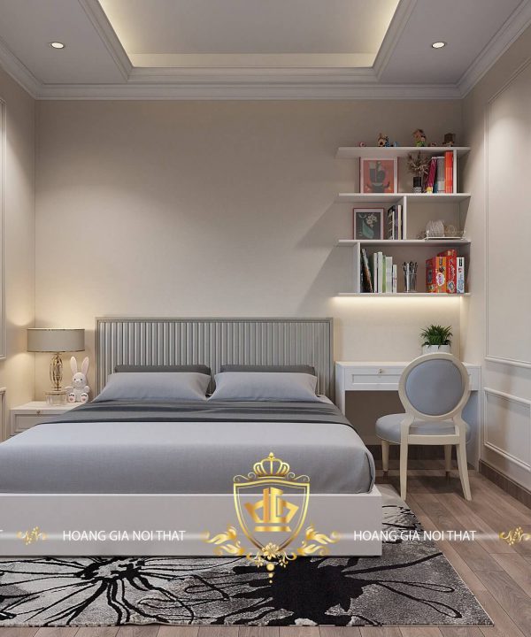 Bàn làm việc và một bàn nhỏ để đèn ngủ được thiết kế cạnh giường ngủ với kích thước vừa phải khiến cho căn phòng thêm tinh tế, màu sắc của giường ngủ và ghế làm việc cùng tone màu ghi xám làm nổi bật căn phòng hơn.