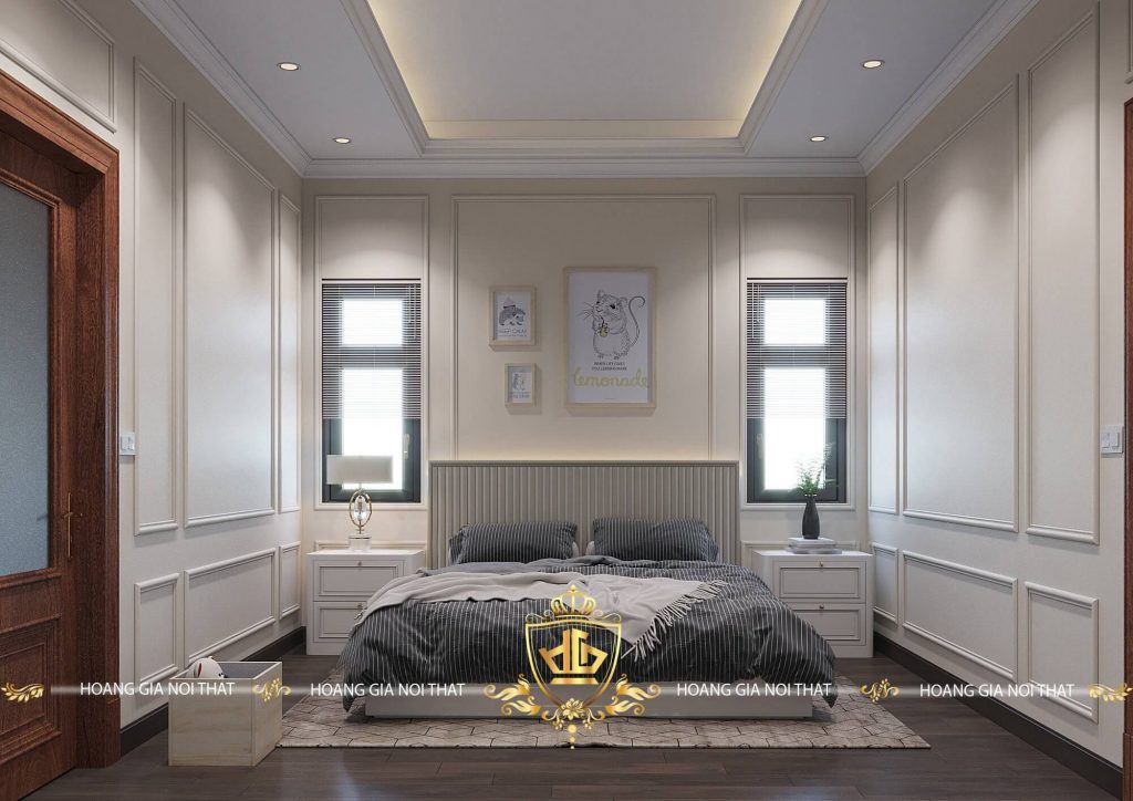 Giường ngủ được thiết kế với 2 tủ nhỏ ngay đầu giường, kèm với đó là 2 cửa sổ để lấy ánh sáng tự nhiên được thiết kế ở 2 bên tủ nhỏ, ở giữa phòng có đặt thêm 3 tấm hình, chính những tấm hình này đã làm thêm điểm nhấn cho toàn bộ căn phòng.
