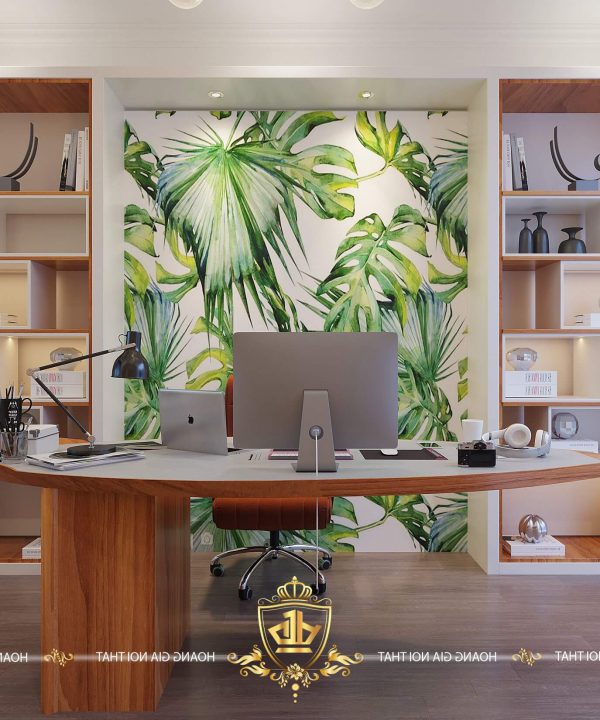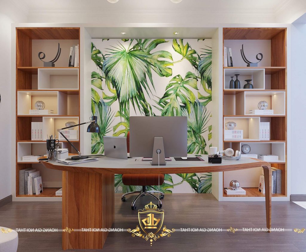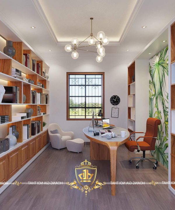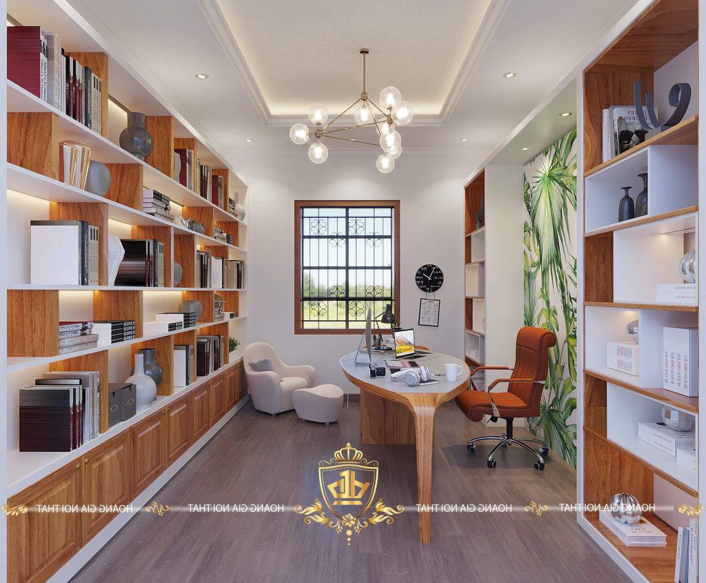 Bàn làm việc được đặt kế bên cửa sổ nhằm mục đích tận dụng triệt để ánh sáng tự nhiên bên ngoài. Tủ sách lớn được làm từ gỗ cao cấp được chia thành nhiều ngăn giúp bạn để sách được nhiều hơn giúp không gian làm việc của bạn hiện đại và ấn tượng.