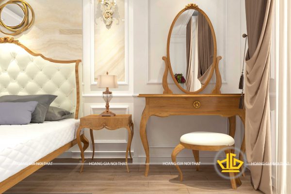 Trong những phòng ngủ tân cổ điển nhẹ nhàng không thể thiếu bàn trang điểm cho phái đẹp. Thông thường, bàn trang điểm tân cổ điển được thiết kế cùng chất liệu và tông màu với giường ngủ tân cổ điển cao cấp để tạo nên sự thống nhất trong phong cách. Bên cạnh đó, đường vòm của gương trên bàn trang điểm tân cổ điển cũng được thiết kế mềm mại, đồng nhất với chi tiết hoa văn của đầu giường.