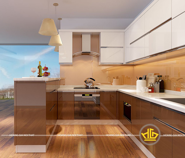 Mẫu tủ bếp Acrylic bóng gương kiểu dáng chữ U sang trọng cho nhà phố
