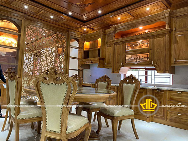 Bộ tủ bếp và bàn ghế ăn được thiết kế, gia công từ gỗ gõ bền, đẹp