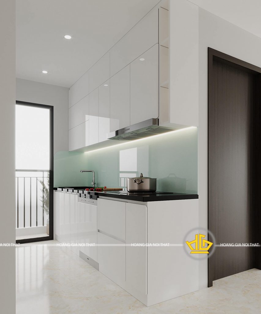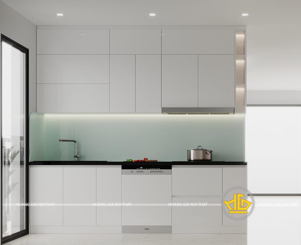 Tủ bếp nhà Chị Nhi được Hoàng Gia thiết kế đơn giản, hiện đại bằng chất liệu gỗ Acrylic màu trắng có bề mặt sáng bóng như gương giúp cho không gian trở nên sang trọng và sáng sủa. Vì không gian bếp nhà Chị Nhi bé nên chúng tôi chọn tủ bếp đơn giản chữ I cao kịch trần vừa tăng sự thẩm mỹ vừa tiết kiệm không gian nấu nướng, đồng thời vẫn đảm bảo được sự tiện nghi, đầy đủ công năng sử dụng cho chị.